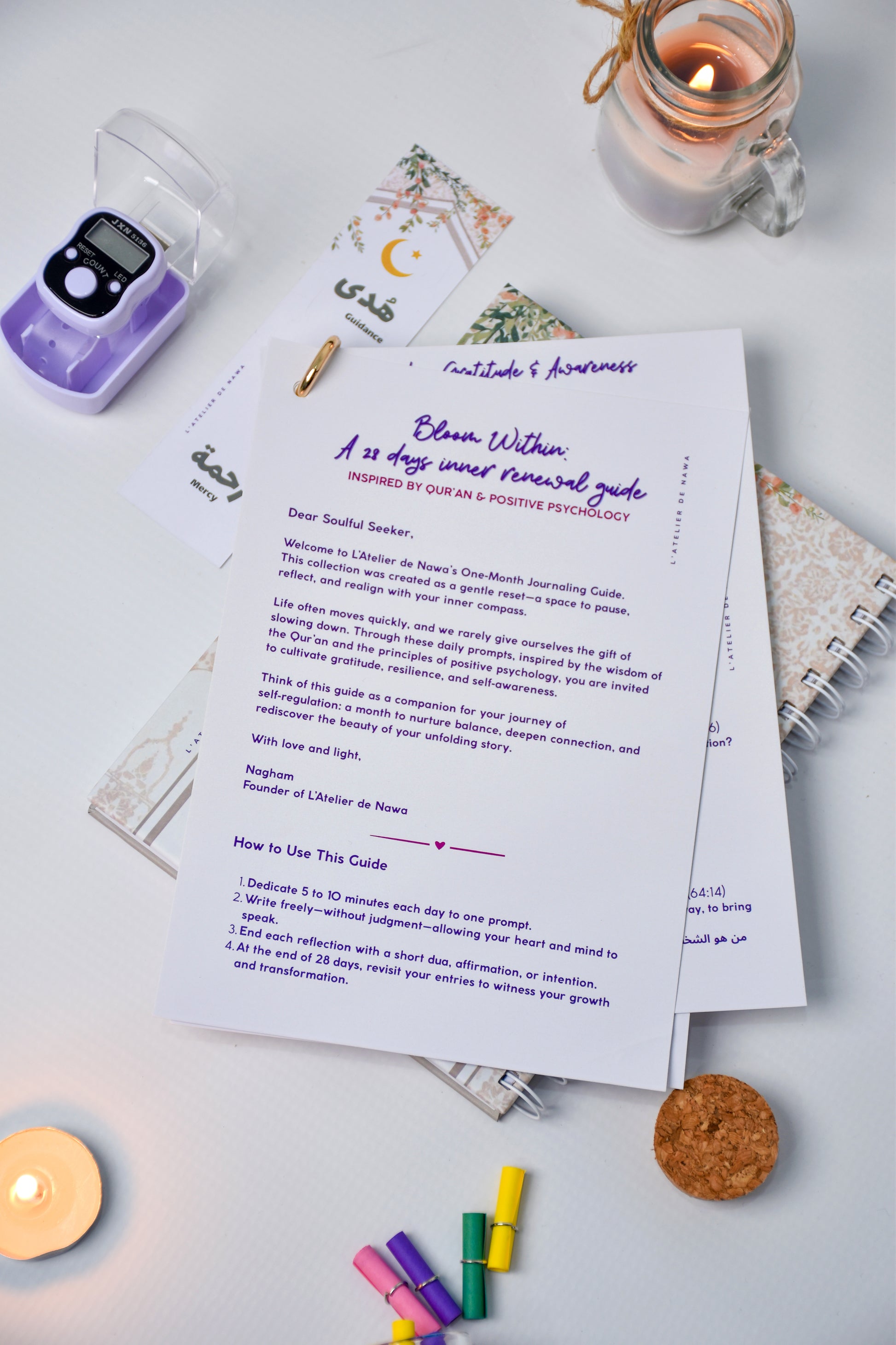 Embrace the Spirit of Ramadan with L’Atelier de Nawa’s Ramadan Reflection Box — a thoughtfully curated set designed to inspire daily mindfulness, creativity, and spiritual growth. Inside, you’ll find a dotted notebook, a digital tasbeeh counter, a bookmark, a decorative sticker sheet, a mini jar filled with Qur’anic verses, and a 28‑day spiritual guide. Each element is crafted to help you record reflections, deepen your connection, and celebrate the beauty of the holy month. Perfect as a Ramadan gift or a personal keepsake, this box brings together faith, creativity, and inspiration in one meaningful package.