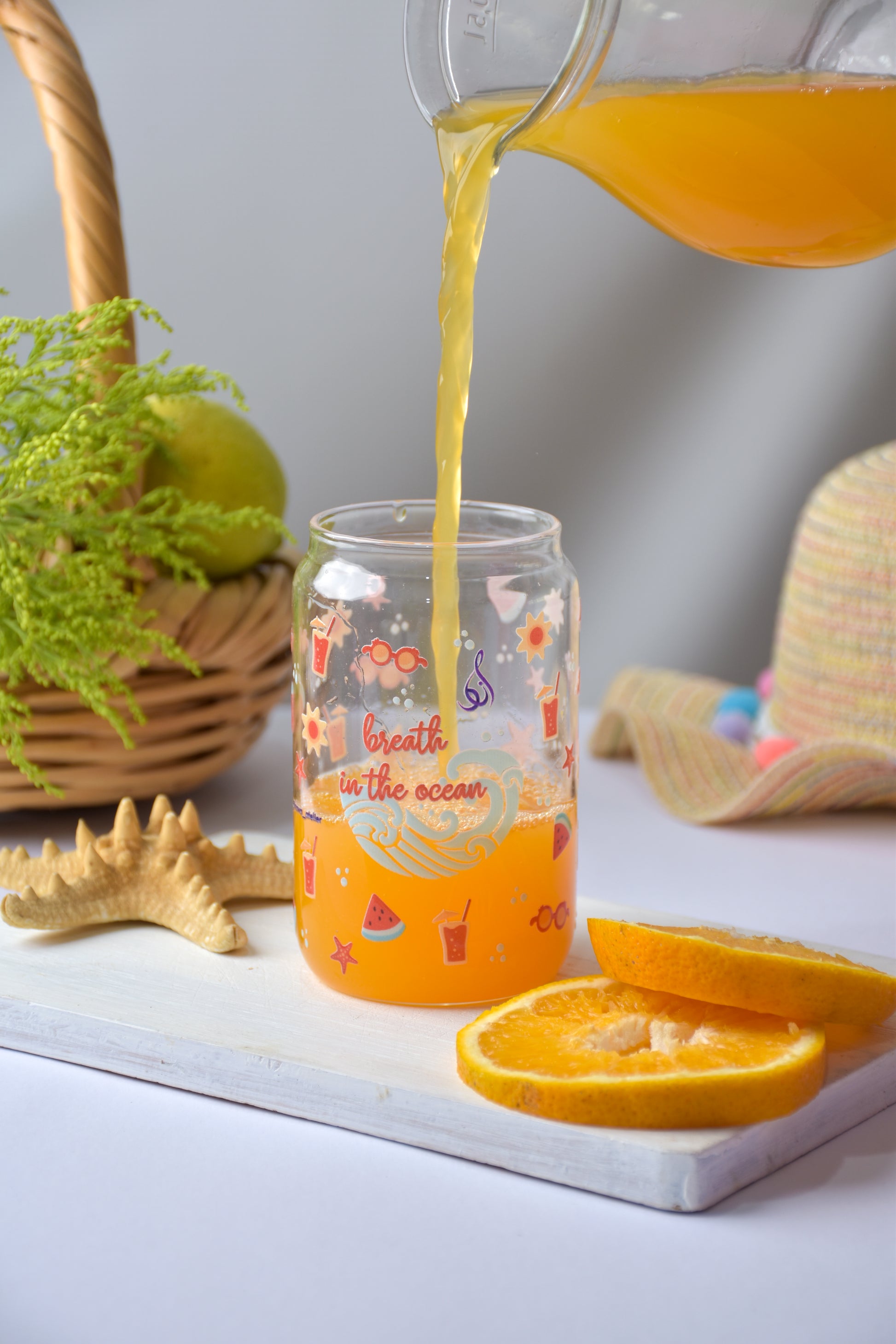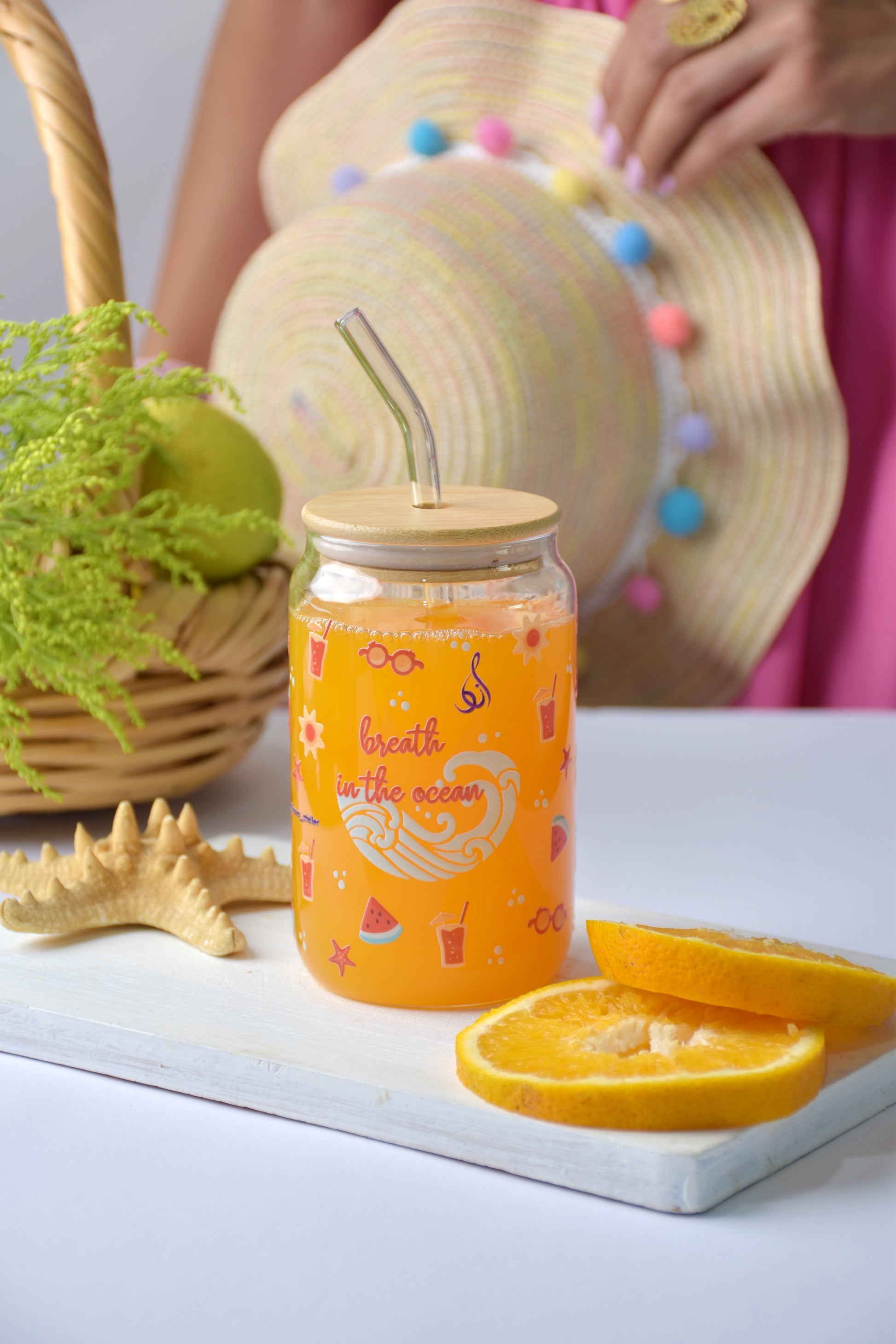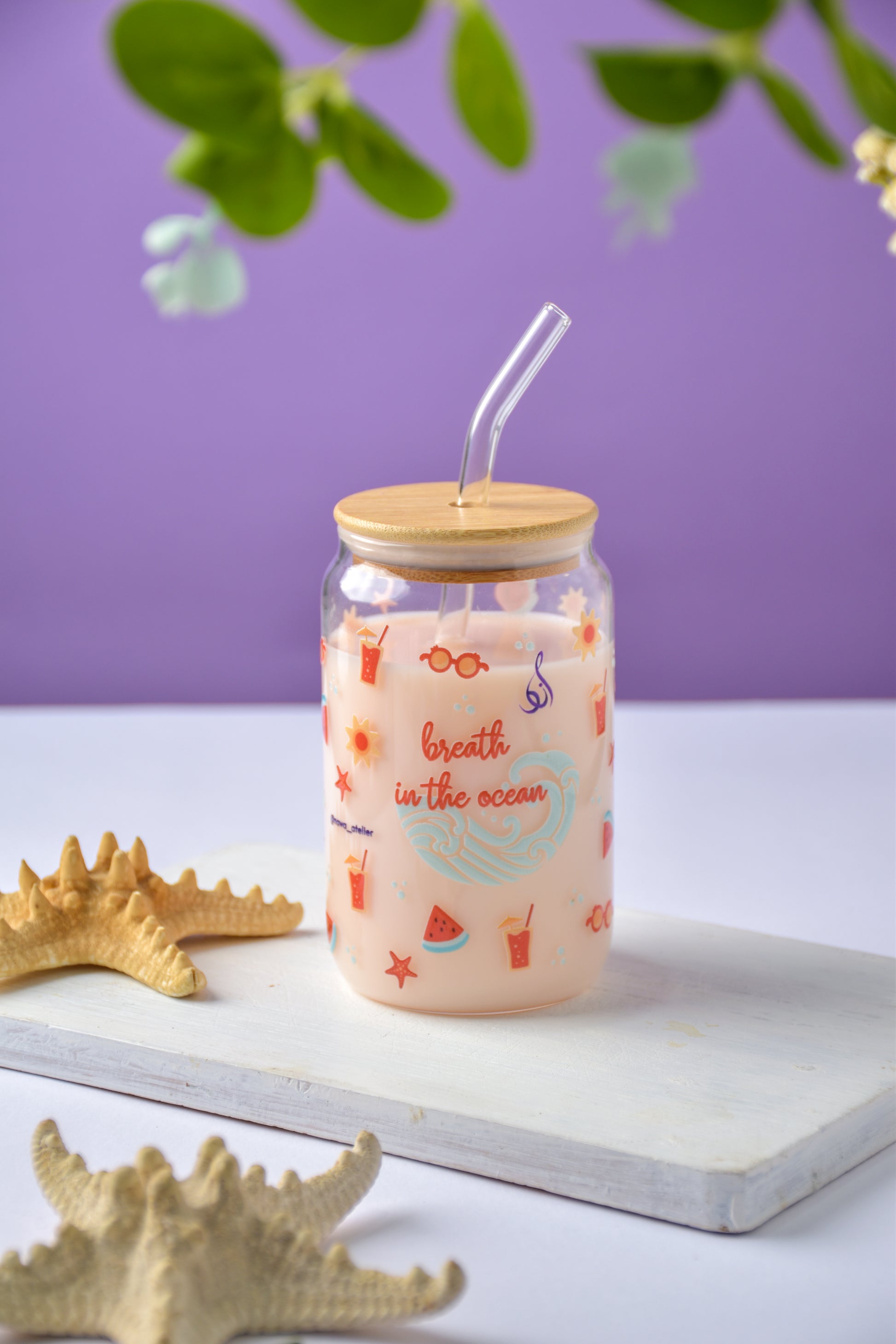 Enjoy every sip with the "Breath In" Glass Cup, featuring a playful Ocean Design. This 16 oz (473 ml) cup glass cup comes with a handy straw, making it perfect for staying refreshed while dreaming of the sea. A fun, breezy way to hydrate all day long!