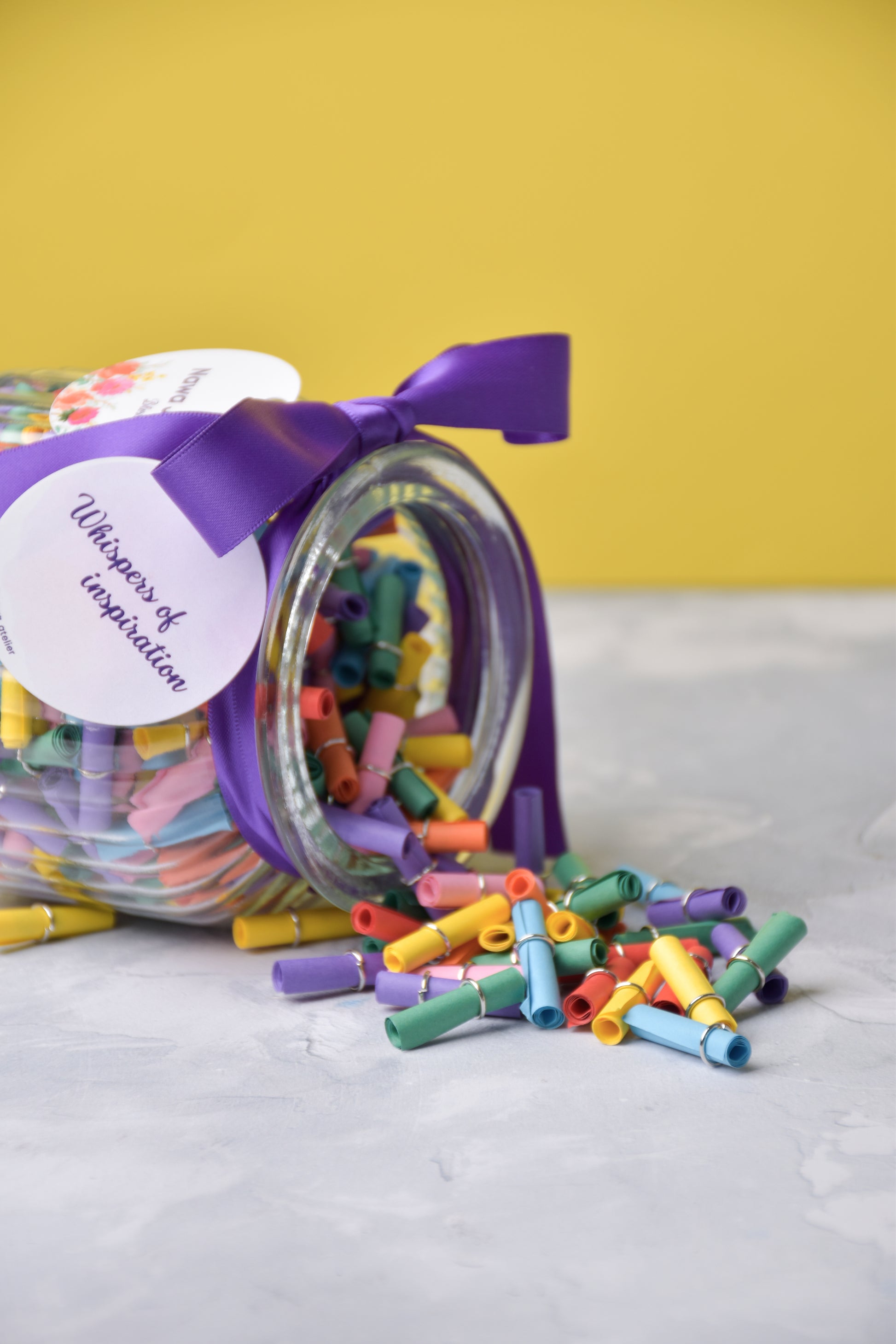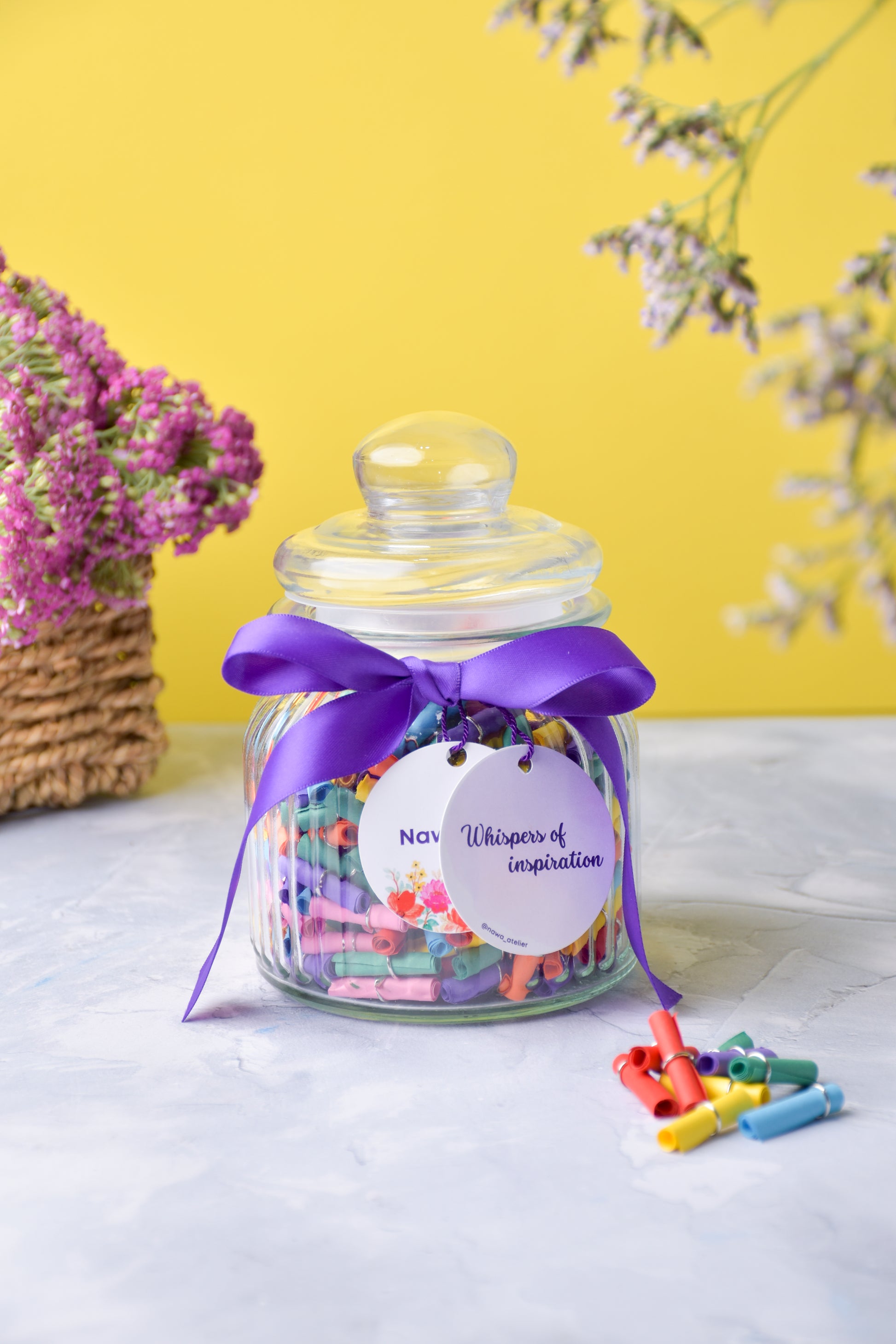 Discover daily inspiration with the Nawa Jar "Blossom", filled with 365 rolled papers in Rainbow colors bearing uplifting quotes or Quranic verses. Pick one each day to brighten your mood, spark your creativity, or find a meaningful message from the universe just for you. Let this Jar guide your daily reflections and keep your spirit blossoming all year long!