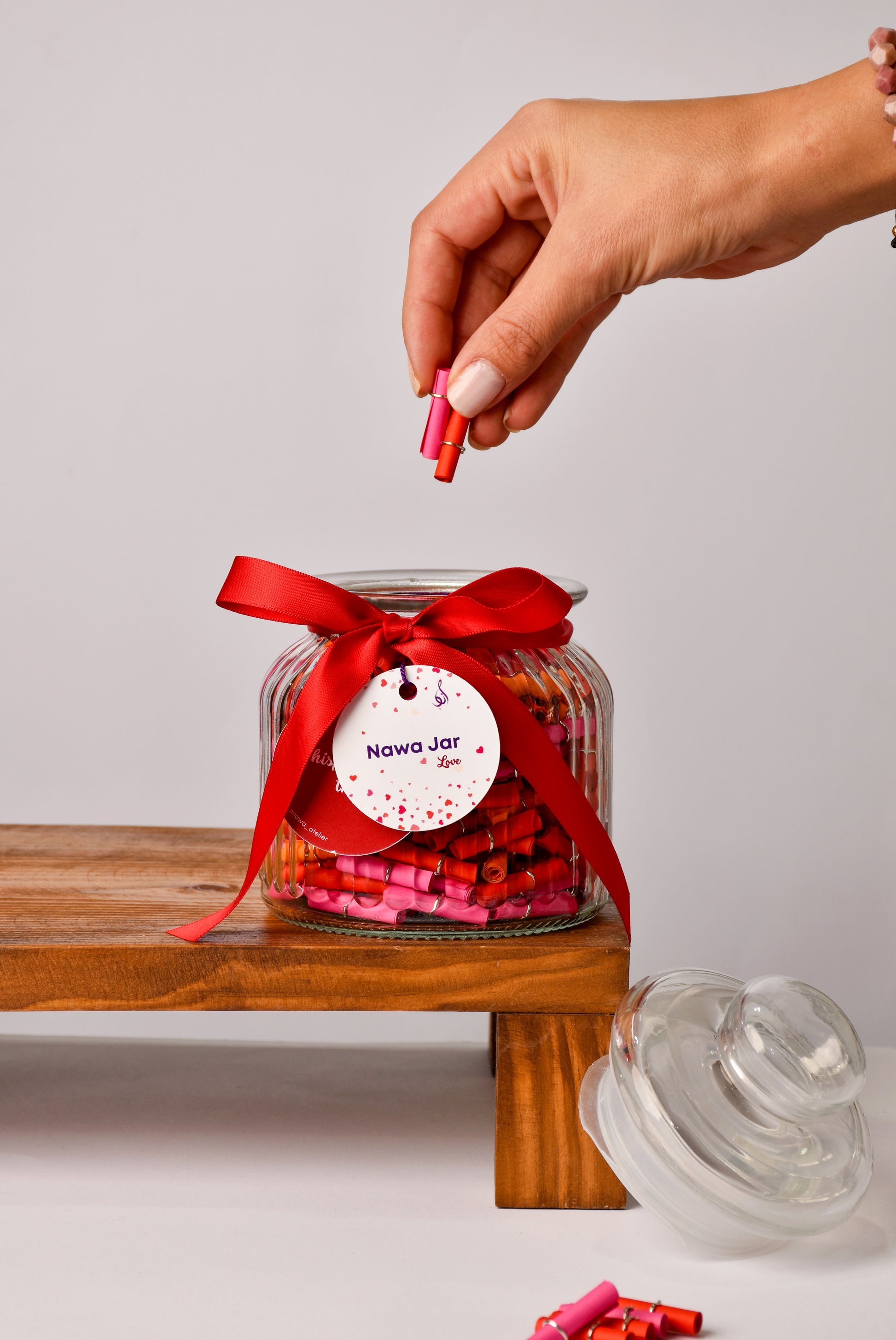 Celebrate love every day with the Nawa Jar “Love” — a vibrant keepsake filled with 365 rolled notes in bright shades of red, orange, and pink. Each message blends heartfelt love quotes and romantic sayings in both Arabic and English, offering daily reminders of affection, passion, and connection. Pick one note each day to spark romance, share a tender moment, or surprise your loved one with words that warm the heart. Designed to inspire joy and intimacy all year long, the Nawa Jar Love is the perfect Valentine’s gift for couples, newlyweds, or anyone who believes in celebrating love every single day.