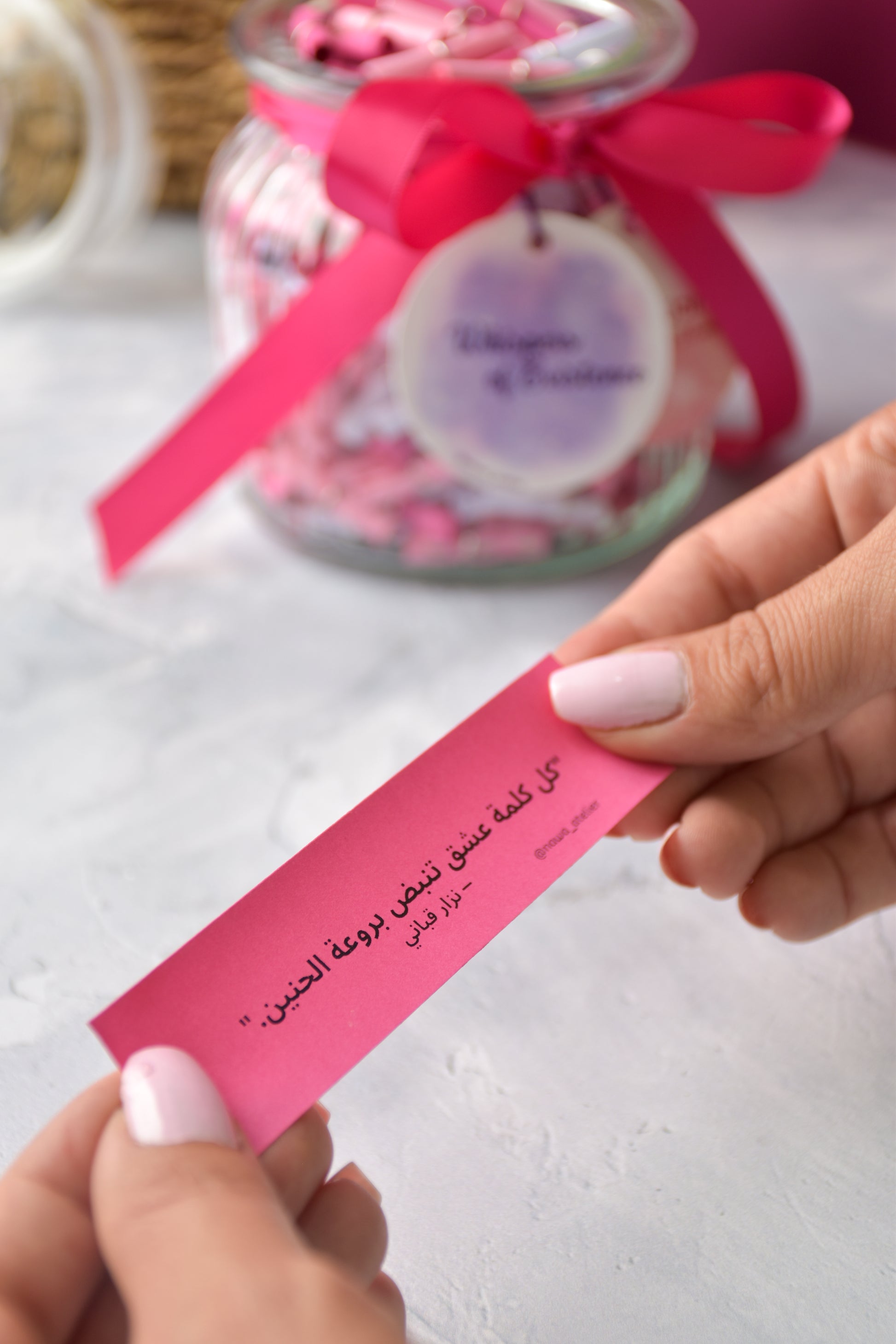 Discover daily inspiration with the Nawa Jar "Pink Bloom", filled with 365 rolled papers in Pink Shades bearing uplifting quotes or Quranic verses. Pick one each day to brighten your mood, spark your creativity, or find a meaningful message from the universe just for you. Let this Jar guide your daily reflections and keep your spirit blossoming all year long!