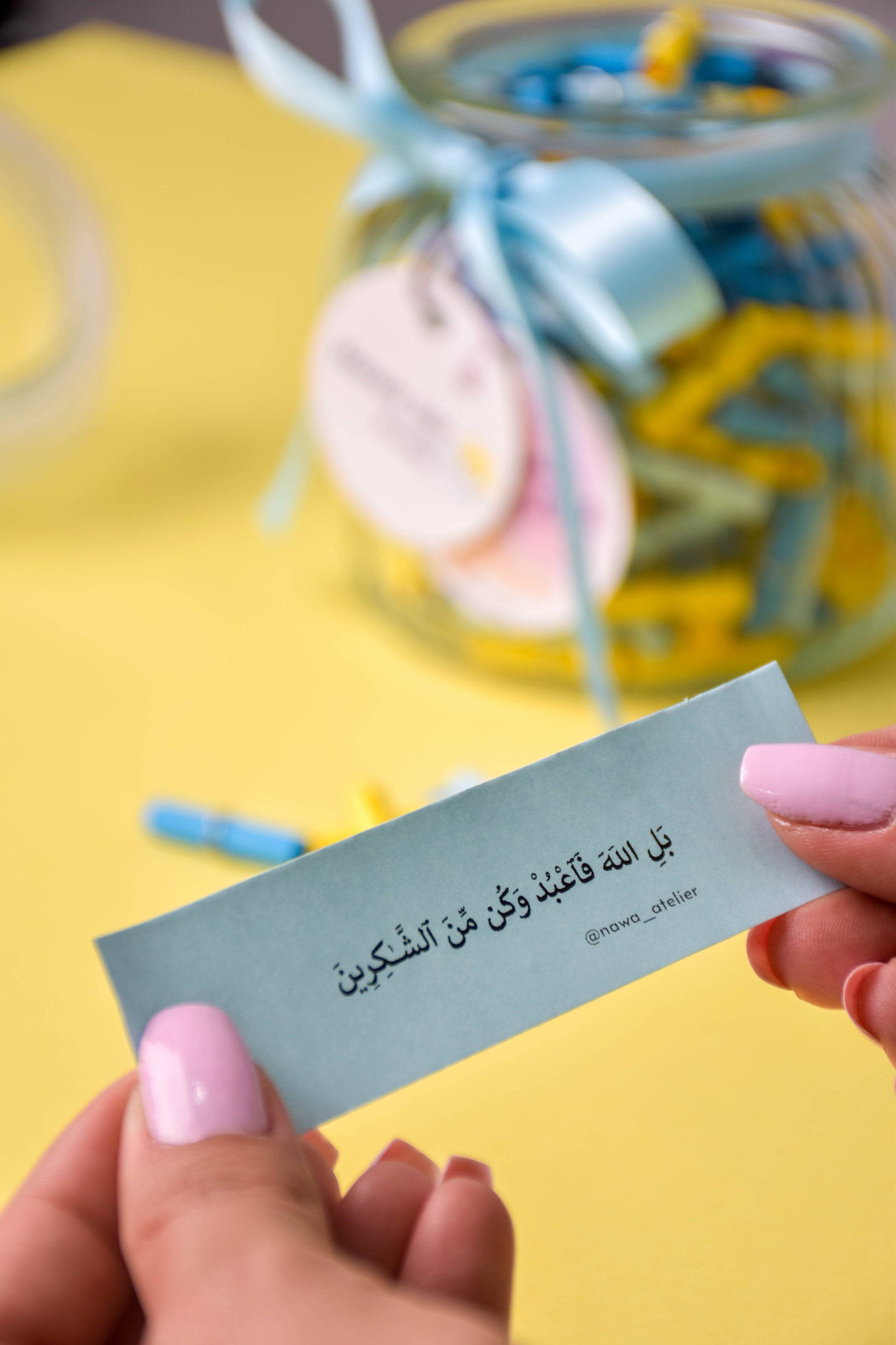 Discover daily Quranic inspiration with the Nawa Jar, filled with 365 rolled papers bearing Quraan verses. Pick one each day to find a meaningful message from God just for you. Let this Jar guide your daily reflections and keep your soul blossoming all year long!