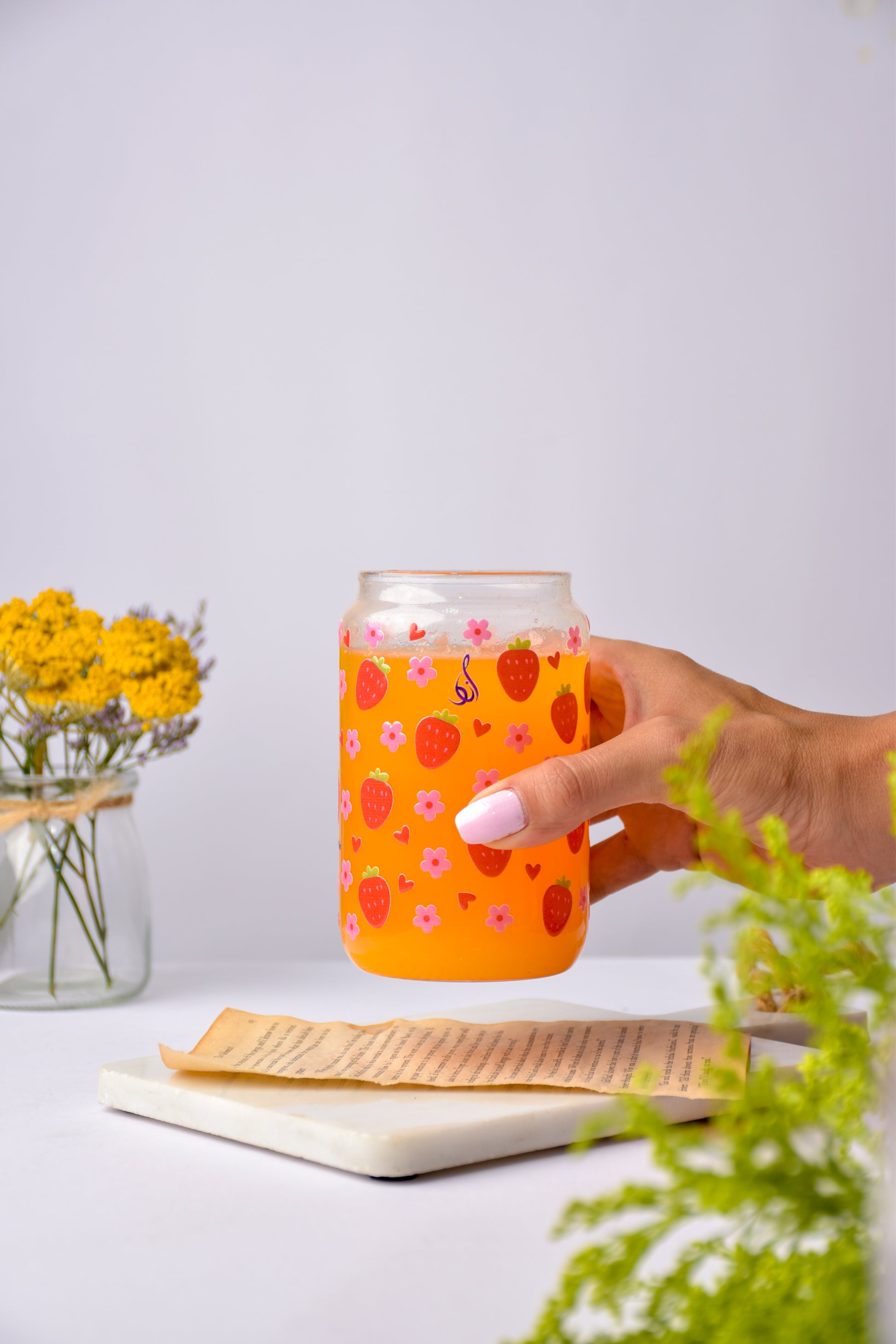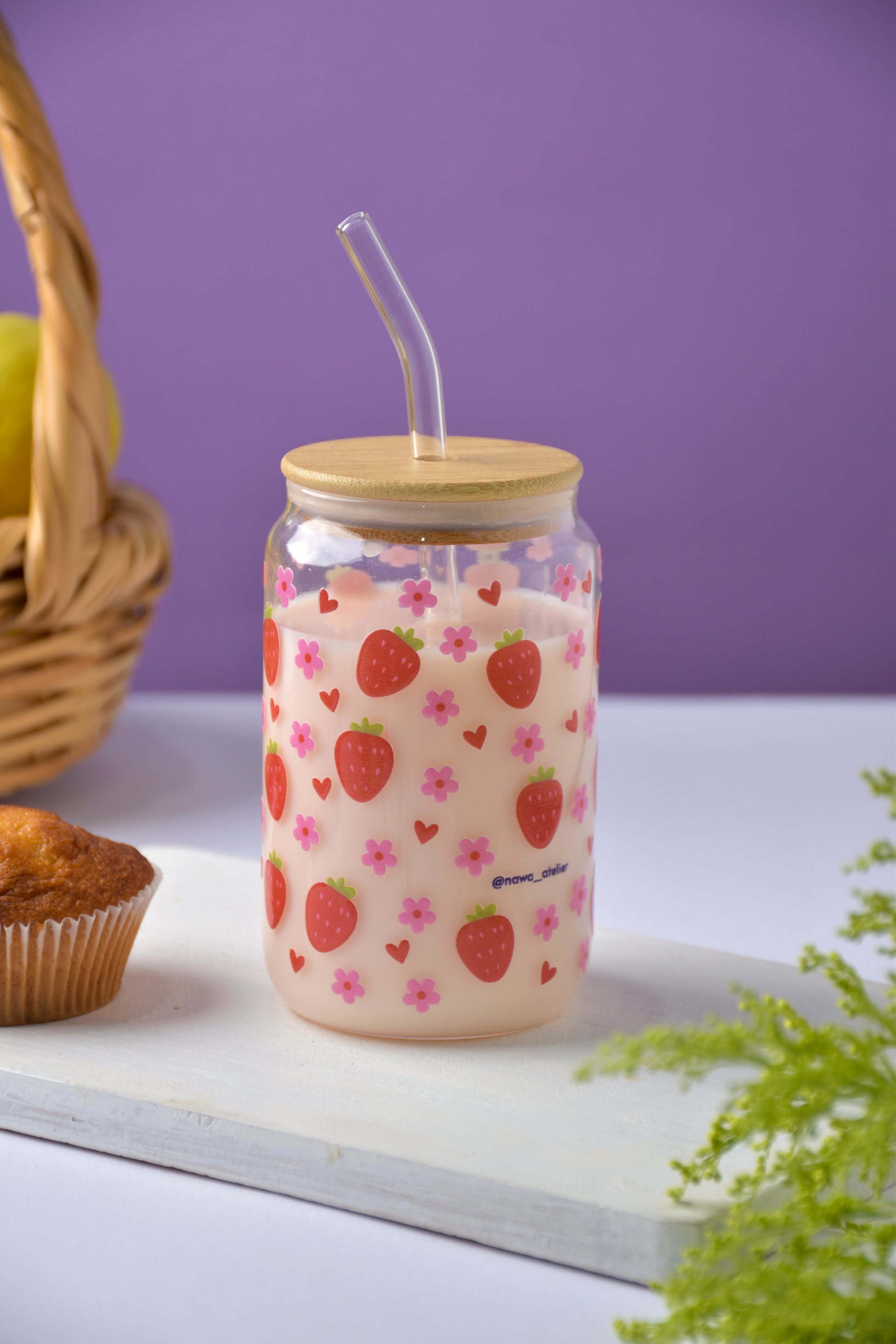 Sip in style with the "Strawberry Love" Glass Cup! This 16 oz (473 ml) cup showcases playful strawberries and floral design, adding a burst of fun to your favorite drinks. It comes with a handy straw, making every refreshing moment even sweeter.